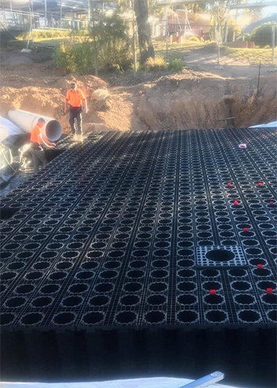 Designers needed to incorporate a durable stormwater management system to deal with large runoff volumes from the site and stormwater collected from pavements. An accessible detention system was therefore required to spread the peak flow of storm events to meet local government requirements.